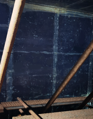 在湿法脱硫工艺中,脱硫浆液通过喷淋系统高速喷洒,对塔内壁、喷淋层、支撑梁、塔底浆池等部位产生持续的冲刷磨损,光固化纳米防腐卷材具备优异的机械强度及耐磨、耐冲刷、抗裂、抗撞击性能,其硬度高、耐磨性远超传统衬胶、鳞片胶泥等材料,能有效抵抗浆液颗粒的高速冲刷和物料摩擦,显著降低脱硫塔易磨损部位的损耗,选用该类卷材有效抵御了高温含硫烟气及浆液溢流带来的冲刷腐蚀,避免了防腐层剥离、基材锈蚀等问题。