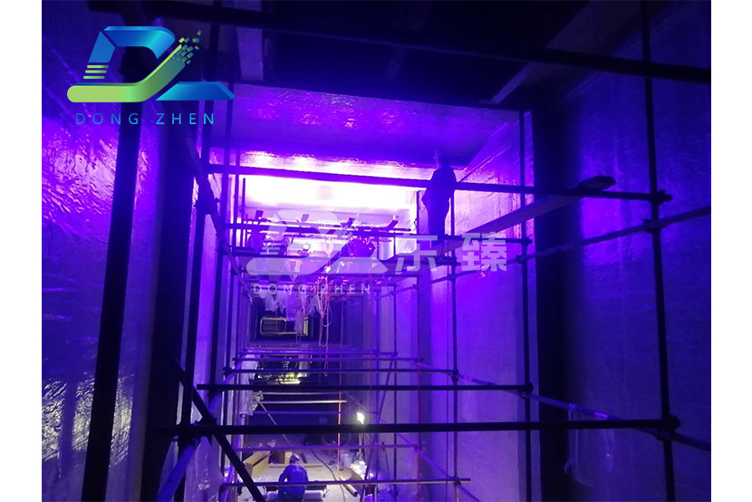 根据该烟道的工况使用我公司的光固化防腐卷材在烟道施工,本材料采用紫外线照射固化或者室内使用专业灯光照射UV固化,从而形成一种超高强度、高附着力、无缝密封的防腐防火绝缘保护套层,大幅度缩短施工时间。